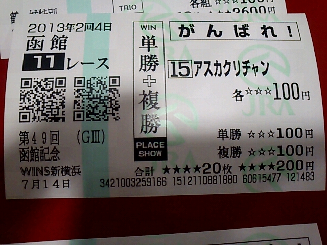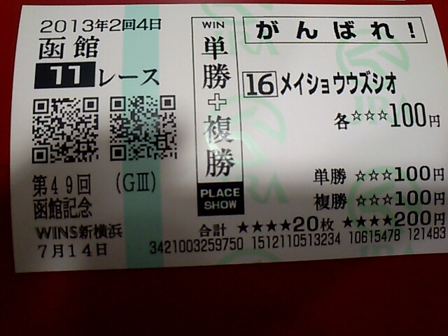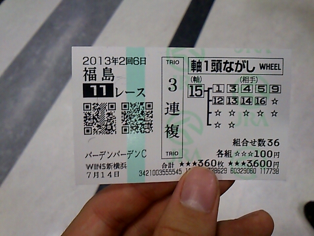 福島函館 未選択 2013年07月15日 出-12300 入+6800 損益-178880うわーん!今日はマケタ。友人と一緒に行って、友人が予想に自信があるということなので予想に乗ってみた。買い方がまずかったなあ。あと、週間競馬ブックが欲しかったんだが、置いてない。都心でどこかに売ってるとこないかなあ。 PR