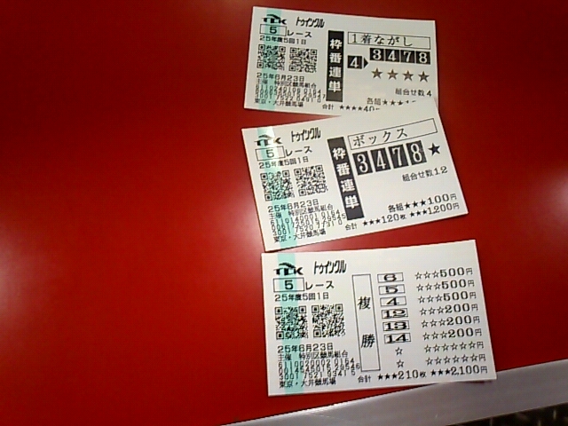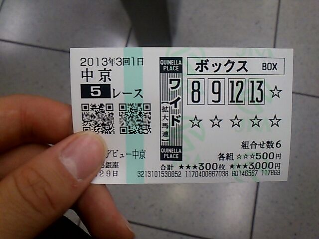 無題 未選択 2013年06月23日 出-1200 入+0 損益-143270東京(日) 2R 複 勝 16 500円 購入金額 500円 払戻金額 0円(1) 東京(日) 2R ワイド 02-16 100円 (2) 東京(日) 2R ワイド 08-16 200円 (3) 東京(日) 2R ワイド 10-16 100円 (4) 東京(日) 2R ワイド 13-16 200円 購入金額 600円 払戻金額 0円1R ワイド BOX 03,05,10,12 各200円(計1,200円)的中購入金額 1,200円 払戻金額 580円トリガミ今日はもうやめよう。大井もあるし。