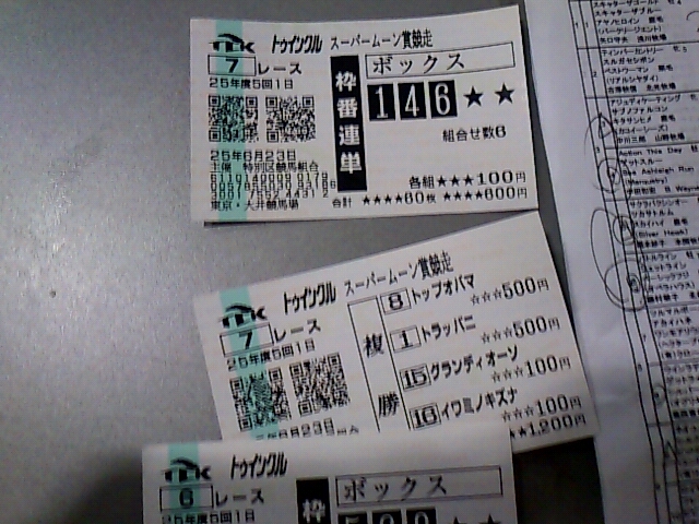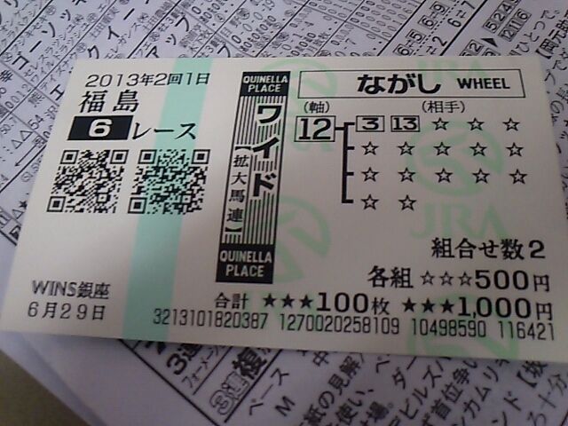 大井競馬 未選択 2013年06月23日 今日の購入馬券画像。出-12800 入+6730 損益-149640当たるのが楽しいからと複勝を買ってきたが、やっぱり外すと厳しいことがわかった。それならば、点数を絞れる枠単と枠連を少なく買い、一点の費用を増やしたほうがいいのではないかという結論に至った。そして、本日の宝塚記念を最後に、IPATで馬券を買うのはやめる。どうしても使い込んでしまうから。これからはちゃんと自分の財布からお金を出して馬券を買おうと思う。