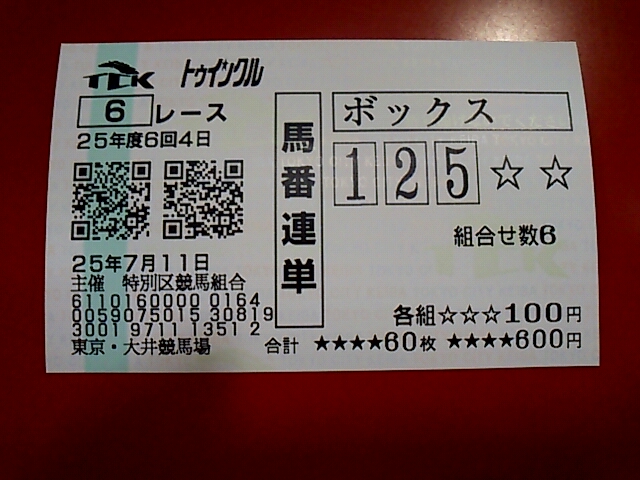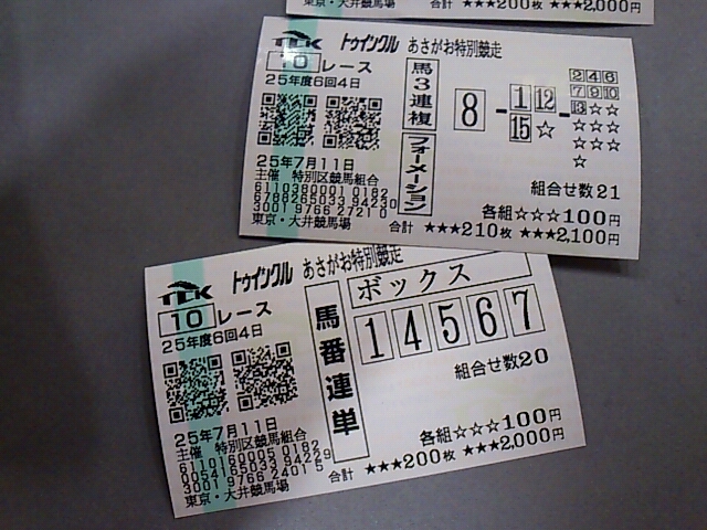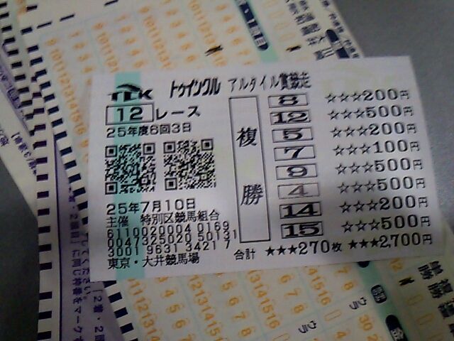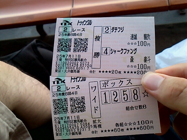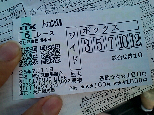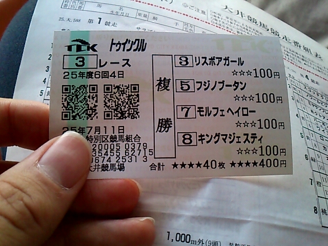 大井!! 未選択 2013年07月12日 出-30100 入+37260 損益-173380友人と大井!久々に使ったwwwwwwなんだか調子づいてしまって色々買ってしまった。枠が調子よさそうだったので枠、3複に転向しようかマジで悩み中。