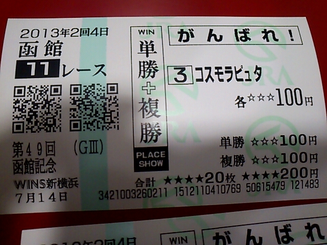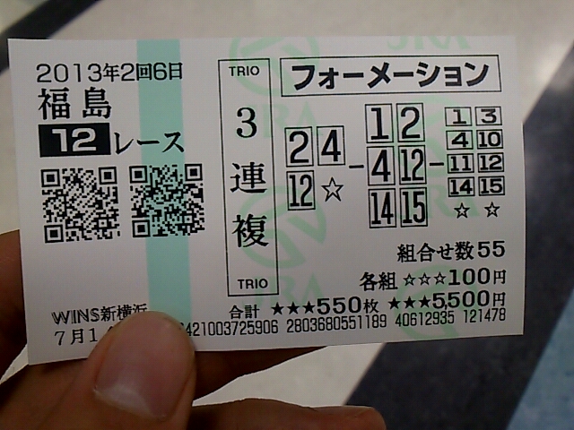 福島函館 未選択 2013年07月15日 出-12300 入+6800 損益-178880うわーん!今日はマケタ。友人と一緒に行って、友人が予想に自信があるということなので予想に乗ってみた。買い方がまずかったなあ。あと、週間競馬ブックが欲しかったんだが、置いてない。都心でどこかに売ってるとこないかなあ。